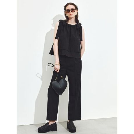 <b>【ウォッシャブル】【肩のリボンが華やかなブラウスと、楽でおしゃれなセミワイドパンツの2枚が、うれしいセットに】</b>