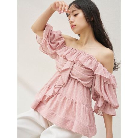 ・大胆なオフショルデザインとボリュームフリルで、顔周りを華やかに演出する一枚。