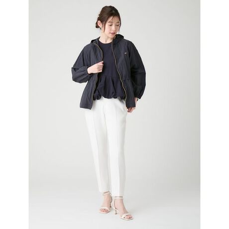 ウエスト切り替えでスタイルアップを叶えつつ、内側に付いたドローコードでさらに絞ってメリハリのあるシルエットにも調整可能です。ファスナーや左胸のチャームには薄いゴールドカラーを使用し、スポーティーさの中にも大人上品なディテールをプラス。