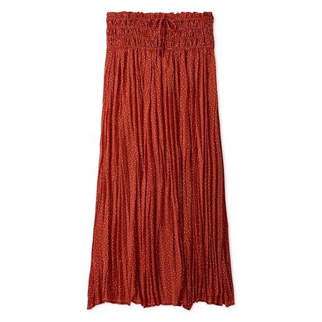 細かなプリーツとドット柄が程よく存在感を放ち、シンプルなトップスと合わせるだけでスタイリングが決まる一枚です。