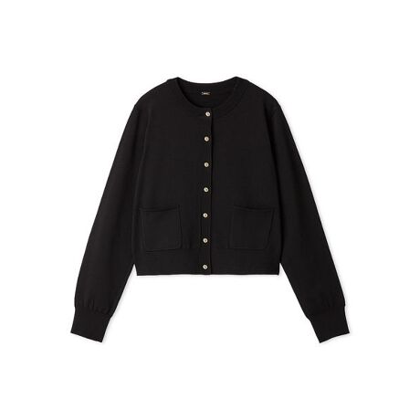 オリジナルのロゴ入り金ボタンがキラリと映える、クロップド丈のカーディガンです。小さめのパッチポケットもアクセント。