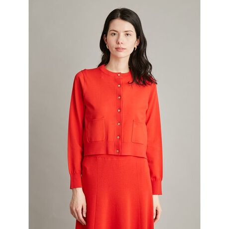 オリジナルのロゴ入り金ボタンがキラリと映える、クロップド丈のカーディガンです。小さめのパッチポケットもアクセント。