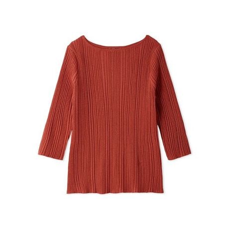 まだ肌寒い日も残る、春の時期にちょうど良い7分袖のニットです。豊かな表情のランダムリブで、ほんのり透け感を出した編み地。襟ぐりのボートネックラインは、女性のデコルテが美しく見え、小顔効果があるようにこだわっています。