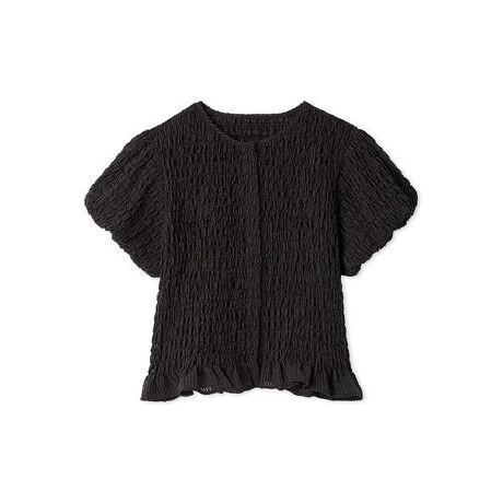 ミニパフスリーブで肩まわりに可愛らしいアクセントをプラス。細かいシャーリング加工で立体感と奥行きを生み、体のラインを拾わないコンパクトなサイジングで着やすさも◎。裾のフリルやフロントホックで、トレンド感とMila Owenらしい上品なムードを両立。</p><p><strong>【Design】</strong>