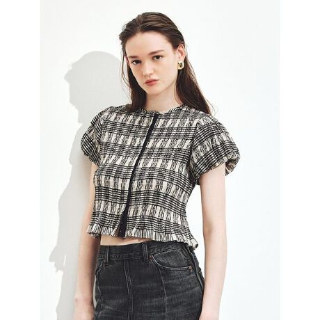 小さなパフスリーブと程よいフリルの裾が女性らしさを引き立てるデザイン。フロントホックは開け方次第で抜け感を演出でき、衿元を閉めて上品に、裾から数個ホックを外してラフに着こなすのもおすすめです。</p><p><strong>【Material】</strong>