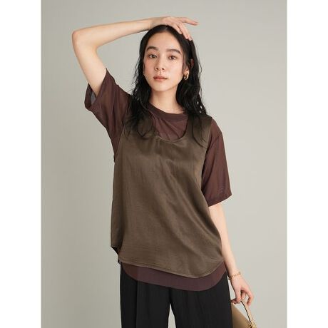 シアーなクルーネッTシャツと、ツヤめくサテン素材のタンクトップ、2枚がセットになったレイヤードトップスです。どちらを上にして重ねてもサマになり、それぞれ単品でも活躍、さまざまな着こなしが楽しめます。