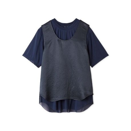 シアーなクルーネッTシャツと、ツヤめくサテン素材のタンクトップ、2枚がセットになったレイヤードトップスです。どちらを上にして重ねてもサマになり、それぞれ単品でも活躍、さまざまな着こなしが楽しめます。