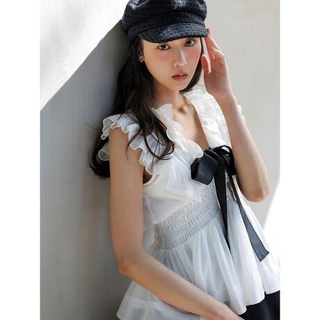 ・シアー素材の軽やかさとペプラムシルエットが女性らしさを引き立てます。