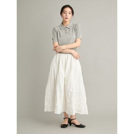 ポロの丈感が短すぎず、スカートとのバランスが取りやすいです。スカートはウエスト位置が高めで脚長に見え、ワッシャー加工が軽やかな印象に。セットで着るとトレンド感がありつつ上品にまとまります。</p>【トップス】