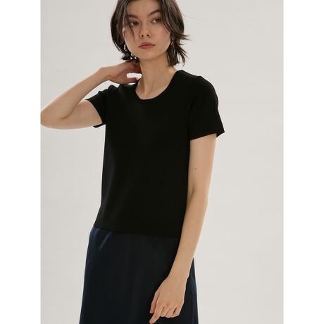 鎖骨がさりげなく見える美しいネックラインが印象的な半袖ニットトップス。