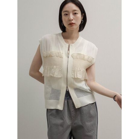 胸元にあしらったフリルが華やかさを添えるメッシュニットベスト。