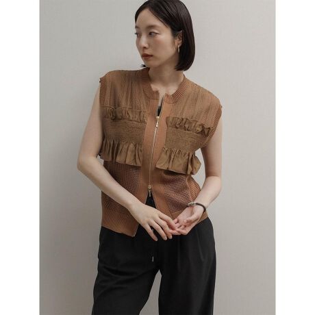 胸元にあしらったフリルが華やかさを添えるメッシュニットベスト。