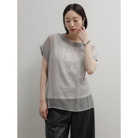 ニットとシアーの異素材からさりげなく覗くロゴプリントタンクが目を惹くトップス。