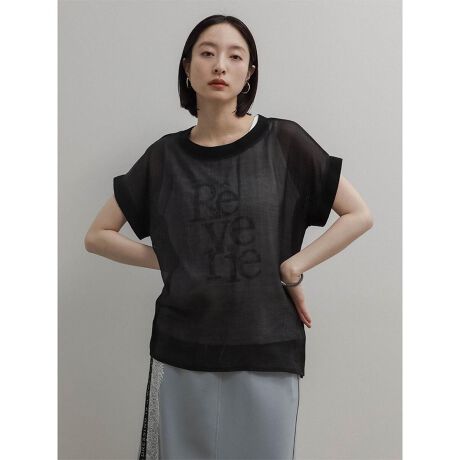 ニットとシアーの異素材からさりげなく覗くロゴプリントタンクが目を惹くトップス。