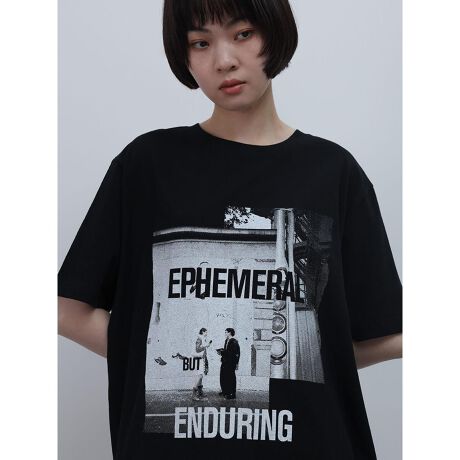 1枚でこなれ感のある着こなしに仕上がるモノクログラフィックTシャツ。
