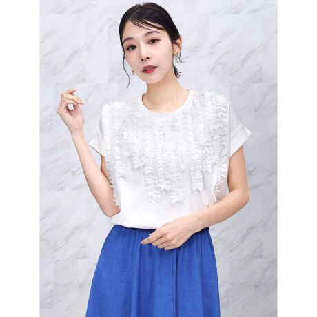 立体感のあるフリルデザインが華やかなアクセントとなり、カットソーでありながらブラウスのように上品な印象に仕上げています。