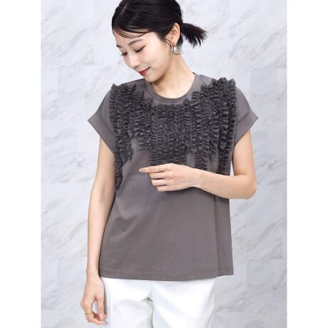 立体感のあるフリルデザインが華やかなアクセントとなり、カットソーでありながらブラウスのように上品な印象に仕上げています。