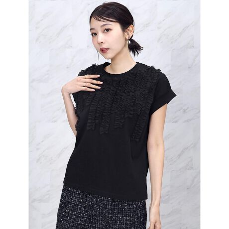 立体感のあるフリルデザインが華やかなアクセントとなり、カットソーでありながらブラウスのように上品な印象に仕上げています。