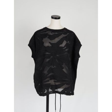 ジャガード織りによる柄の凹凸感が着こなしに表情と奥行きを与えるフレンチスリーブのカットソー。前後身頃は異素材切替のデザインになっており、フロントの透け感がシーズンムードを高めます。さらに裾の紐を絞ることでちょっとしたシルエットアレンジもできる為、ボトムに合わせたバランスの良い着こなしが叶います。