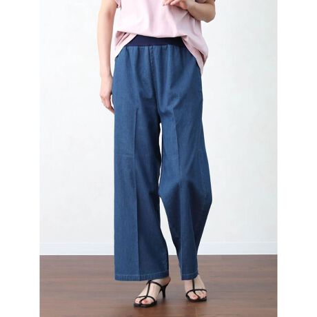 柔らかなコットンデニム素材が自然な落ち感を生み、動きやすさと軽やかな印象をプラスします。