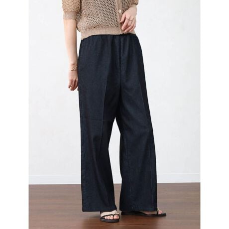 柔らかなコットンデニム素材が自然な落ち感を生み、動きやすさと軽やかな印象をプラスします。