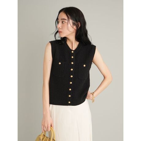 クロシェ風の凝った編み地がリッチな印象の、リュクスなニットベストです。