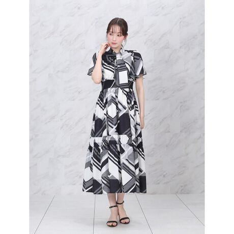 幾何学柄がスタイリングにアクセントを添えるプリントワンピース。