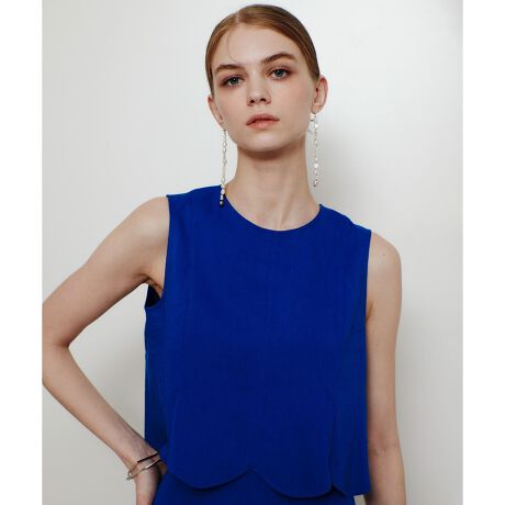 裾にあしらったスカラップがポイントのノースリーブブラウス。滑らかな風合いのリネン混素材で、ほどよいカジュアルさと初夏らしい爽やかさを感じられる1枚です。バストの下までは体に沿わせ、裾にかけてタックで立体感を出し体から離れるボックスシルエット。後ろ身頃の飾りホックがきらりと光るアクセントに。同素材のスカラップスカート(21261011200)とセットアップでの着こなしがイチオシですが、ワイドストレートデニムパンツ(21261012070)などハイウエストデザインのパンツとの合わせて頂くと、甘さを抑えた爽やかなコーディネートになります。