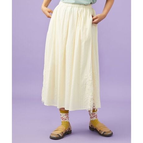 ストライプ状の地柄を持つ薄手の綿ドビー素材に繊細なレースを施したスカート。軽い着心地で、ロングシーズンお召しいただけます。