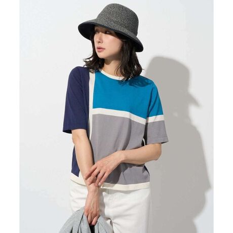 ・大胆なカラーブロック柄をインターシャで編上げたニットです。