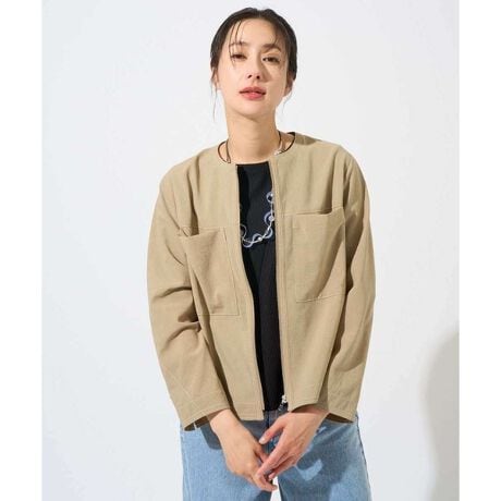 ・襟のないノーカラージャケットはパーカーのフードを出したり、タートルネックなどを合わせたりと、首周りのレイヤードを楽しめる一着です。