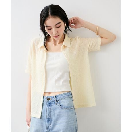 フロントのダイヤモンドカットのクリア釦がとてもキュートで、女性らしい一着です。フロントの釦を全部閉めてシャツとして着たり、カーディガン風に羽織ったり、2つのコーディネートが楽しめます。
