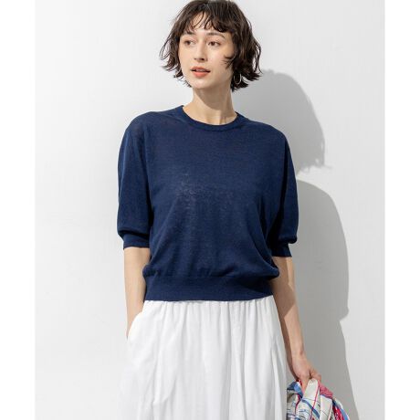 やや膨らみを持たせたパフスリーブのデザインと体のラインを拾いすぎないゆったりとしたシルエットが涼しげでリラックスした雰囲気を演出する大人のニットTシャツです。上質なリネン素材を使用することでTシャツ感覚で着られながらもカジュアルになりすぎず上品な印象を与えます。デニムと合わせた休日のカジュアルスタイルからきれいめなスカートやパンツと合わせたエレガントなスタイルまで幅広いシーンで活躍する一枚です。カラーは、鮮やかな色味が目を惹くレッド(#010)、麻本来のナチュラルな風合いを楽しめるベージュ(#033)、爽やかな印象を与えるグリーン(#060)、シックで知的な大人ネイビー(#075)の4色展開です。