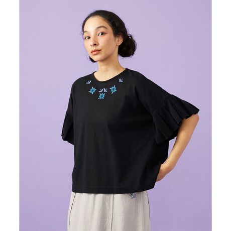 かわいらしさと上品さを兼ね備えたプリーツ袖カットソー。ドロップショルダーとゆとりのある身幅の、リラクシーな着用感がポイントです。身頃にはカットソー素材、袖にはプリーツ編みのニットパーツを組み合わせた異素材ドッキングデザイン。胸元にあしらったお花刺繍が、さりげなく上品なアクセントに。きれいめな雰囲気でコーディネートを楽しめるカットソーです。