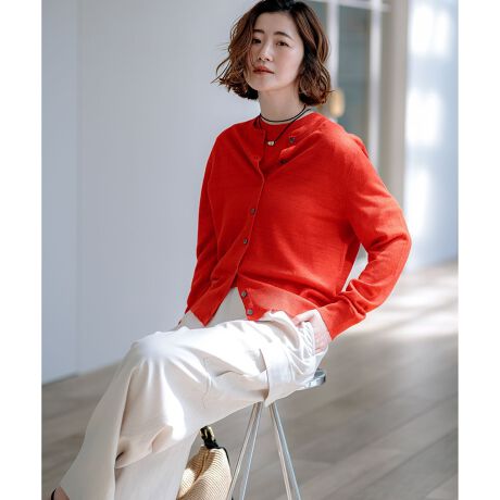 上質なリネン100%の素材感が際立つ、シンプルながらも洗練されたクルーネックカーディガンです。フロントにあしらわれた本貝ボタンが、さりげなく上品な輝きを添えています。 カーディガンとして軽く羽織り、コーディネートのアクセントカラーとして楽しむのはもちろん、ボタンを全て留めてプルオーバーのように着こなせば、クラシカルで品のあるスタイルが完成します。ワンピースにさらりと合わせたり、きれいめなパンツスタイルでオフィスシーンに活用したりと、オンオフ問わず幅広いシーンで活躍する一枚です。 カラーは、鮮やかな色味が目を惹くレッド(#010)、麻本来のナチュラルな風合いを楽しめるベージュ(#033)、爽やかな印象を与えるグリーン(#060)、シックで知的な大人ネイビー(#075)の4色展開です。