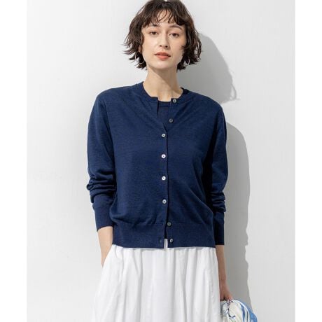 上質なリネン100%の素材感が際立つ、シンプルながらも洗練されたクルーネックカーディガンです。フロントにあしらわれた本貝ボタンが、さりげなく上品な輝きを添えています。 カーディガンとして軽く羽織り、コーディネートのアクセントカラーとして楽しむのはもちろん、ボタンを全て留めてプルオーバーのように着こなせば、クラシカルで品のあるスタイルが完成します。ワンピースにさらりと合わせたり、きれいめなパンツスタイルでオフィスシーンに活用したりと、オンオフ問わず幅広いシーンで活躍する一枚です。 カラーは、鮮やかな色味が目を惹くレッド(#010)、麻本来のナチュラルな風合いを楽しめるベージュ(#033)、爽やかな印象を与えるグリーン(#060)、シックで知的な大人ネイビー(#075)の4色展開です。