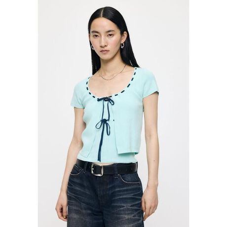 【STITCH DETAIL CD & CAMI/ステッチ ディール カーディガンアンドキャミ】■ポイントステッチワークがアクセントになった、レイヤード風ニットトップス。キャミソールセットで、1枚でスタイリングが完成する優秀アイテムです。■ディテール配色ステッチやフロントのリボンディテールが、クラフト感をプラス。キャッチーな印象です。インナーキャミは単品でも使える設計で、着回し力も魅力です。■スタイリングデニム合わせでカジュアルに、スラックスやミニボトムでトレンド感のある着こなしに。コンパクトな丈感なので、ハイウエストボトムとの相性も抜群です。