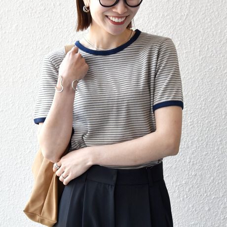 カジュアルになりすぎない細めピッチのボーダーに、ラウンドネックで女性らしい優しい印象に。