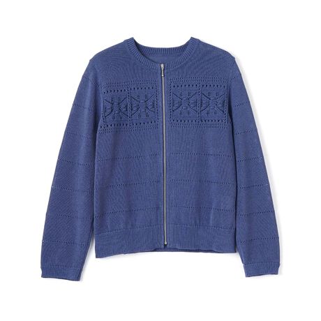 胸元の繊細な透かし編み模様が上品なアクセントを添える、ジップアップカーディガン。