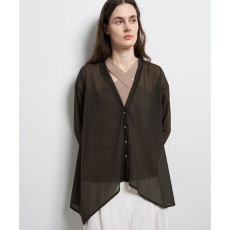 夏の冷房対策や日よけにも重宝する軽やかな一枚です。Vネックのリラックスシルエットで、きれいな着映えを実現。アシンメトリーヘムが裾まわりに抜け感をプラスし、ヒップラインをさりげなくカバーしてくれます。
