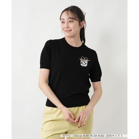 レーヨンにナイロンをブレンドした、滑らかな肌触りと上品な光沢感が魅力のクルーネックニットです。左胸に施されたバッグから愛らしい黒猫が顔を出すインターシャ編みと繊細な刺繍が、大人の遊び心をくすぐるアクセントを添えています。コンパクトなシルエットながら身体のラインを優しく包み込み、日常の着こなしに知的な華やかさをプラスしてくれる一枚。ジャケットのインナーとしても映え、季節の変わり目からロングシーズン活躍する頼れるトップスです。
