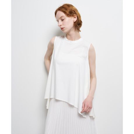 背面には細かなピンタックを施し、そこから生まれるフレアシルエットが体型カバーをしながら、涼しく快適な着用感に。長めの着丈とアシンメトリーな裾のラインが腰回りから目線散らしてくれる効果もあります。