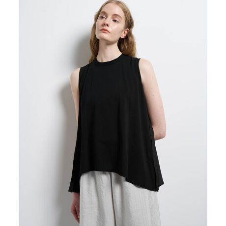 背面には細かなピンタックを施し、そこから生まれるフレアシルエットが体型カバーをしながら、涼しく快適な着用感に。長めの着丈とアシンメトリーな裾のラインが腰回りから目線散らしてくれる効果もあります。