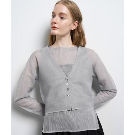 キラキラした光沢が目を惹く、軽やかで涼し気なシアーニット。