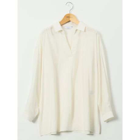 シアー素材で涼し気な雰囲気に仕立てた、プルオーバータイプのシャツチュニックです。すっきりとしたスキッパーカラー、肩を落としたドロップショルダー、タックを入れた袖口のカフス、裾部分のサイドスリットがポイントになっています。