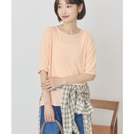 柔らかな肌ざわりの素材で仕立てたシアーTシャツ。程よい透け感でデイリーに着回しやすく、身頃と微配色のステッチがさりげないアクセントに。身幅と着丈にゆとりをもたせたリラックスシルエットで動きやすくこなれた印象に仕上がります。薄手でボトムスにINしやすく、キャミワンピやサロペットのインナーにも最適。肘が隠れる袖丈で二の腕カバーも叶えます。