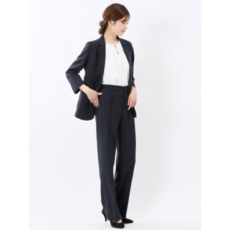ジャケットはボディラインに自然に沿ったベーシックなシルエットです。パンツはストンと落ちる直線が美しい、太すぎないセミワイドです。脚のラインを隠せるので体型カバーや脚長効果も期待できます。