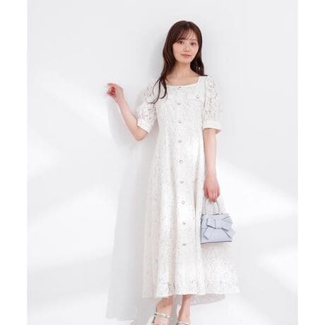 華やかさを叶えるレースワンピース。フロントの飾りボタンが上品なアクセントになり、ボタンの隙間からインナーが見えないのも嬉しいポイント。後ろファスナーで着脱できます。顔まわりをスッキリ見せるスクエアネックとウエスト位置を高くしたデザインで、フェミニンな雰囲気を演出します。