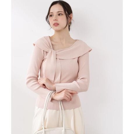 襟ぐりのアシンメトリーリボンがトレンド感を演出してくれるニットトップス。ケープデザインで顔まわりをすっきり見せ、軽やかな印象に仕上げています。スカートはもちろん、デニムと合わせた甘辛ミックスコーデもおすすめです。