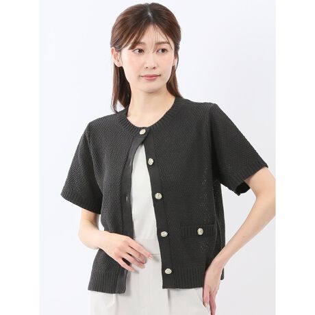 ジャケットのような上品さを漂わせる、半袖のニットカーディガンです。すっきりとしたクルーネック、上品なゴールド調のボタン、飾りポケットがポイント。羽織りとしてもプルオーバーとしても着回せるデザインです。